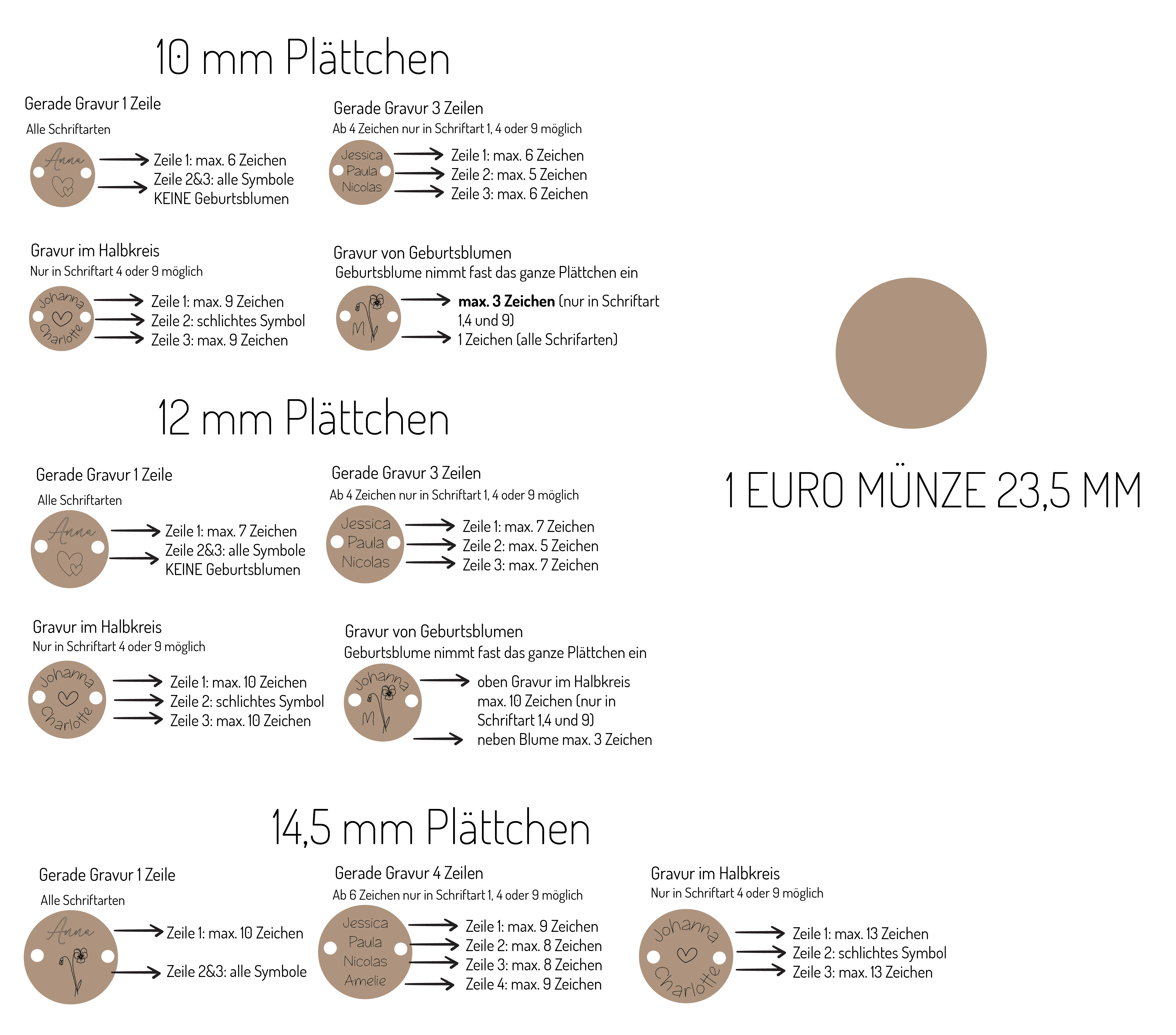 Buchstaben die im X angeordnet sind (Beispiele E1-E4) können nur in der Schrift B4 graviert werden. Achte darauf, dass die man die Symbole mit einer Größe von ca. 1,5 mm bei den 10 mm Plättchen und bei den 12 mm Plättchen mit einer Größe von ca. 2 mm noch erkennen kann. Mittig zwischen den beiden Bohrungen ist weniger Platz, bitte bei der Auswahl ebenfalls darauf achten.
